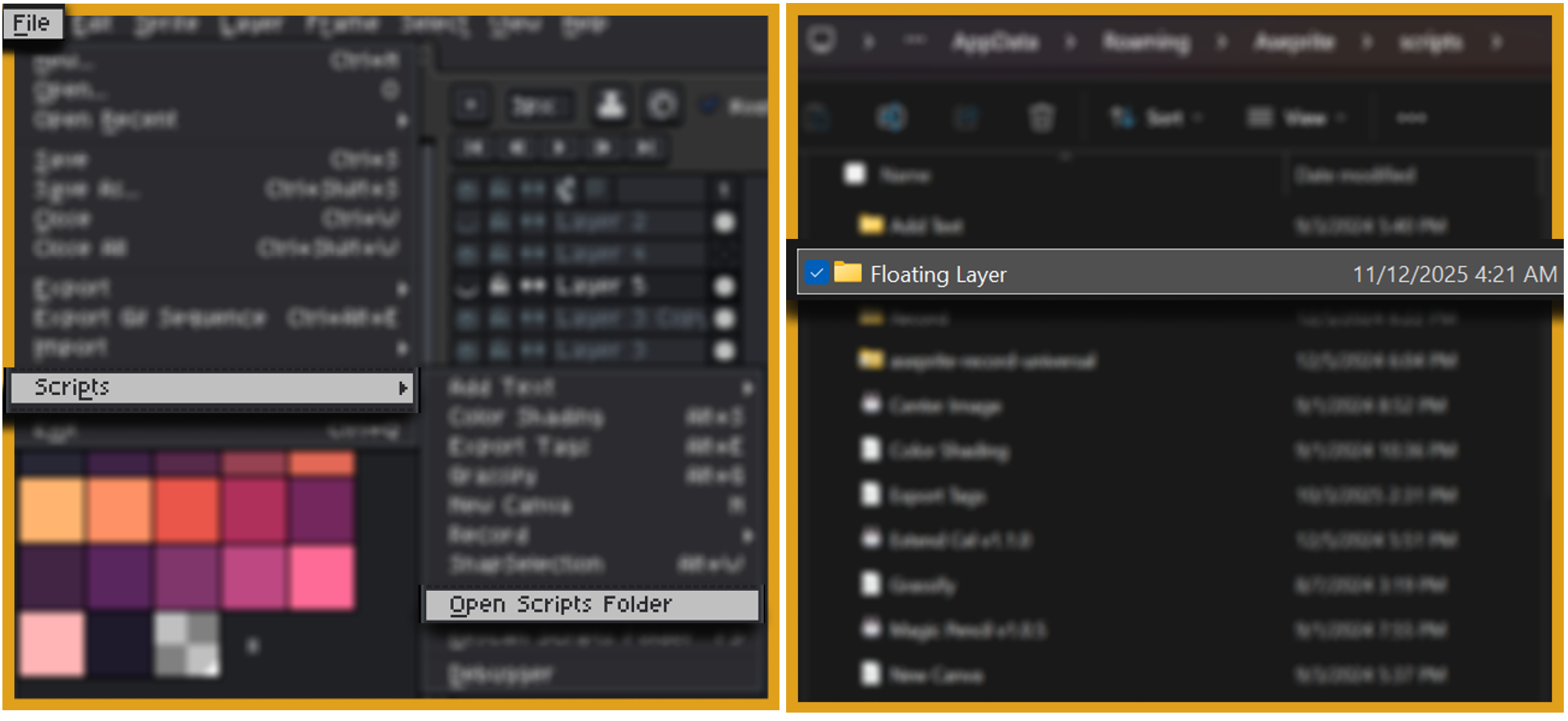 2. Go to Aseprite then, File > Scripts > Open Scripts Folder